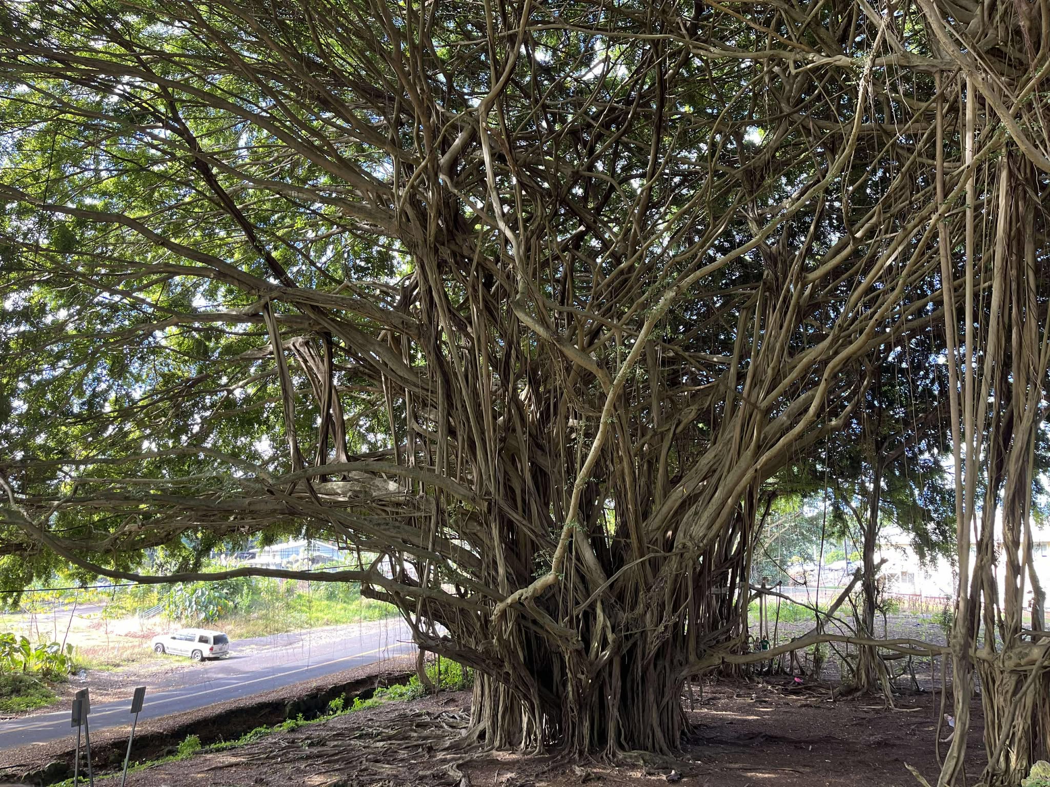 It’s Boys time ! Ce matin, c’est un changement d’habitude qui nous attendait. Notre heure de réveil était devancée de 30 minutes tout comme notre départ qui était à 8h30. Notre destination aujourd’hui : le volcan Kohala. On est monté dans le van et nous étions prêts pour 2h30 de route. Musique à fond, chants, rires et du sommeil pour certains, c’est ce qui nous a conduit jusqu’à notre premier arrêt : la « Rainbow fall ». Cette une chute d’eau qui coule sur une coulée de lave du Mona Loa. Celle-ci a suivi la rivière déjà présente en épargnant ce qui était autour. Une fois la lave solidifiée, l’eau à reprit sa place. Non loin de là, nous avons découvert un nouvel arbre. Cet arbre étrangleur, le « Banyan tree » se greffe à un autre arbre existant pour pousser, tuant ainsi son hôte. Après cette escale, nous étions de retour dans le bolide pour 1h30 de route restante.
