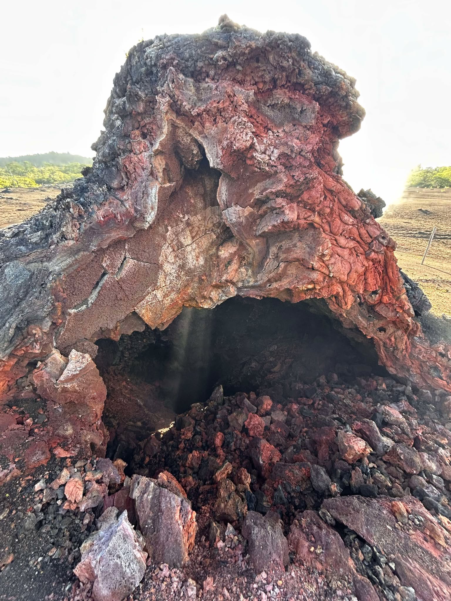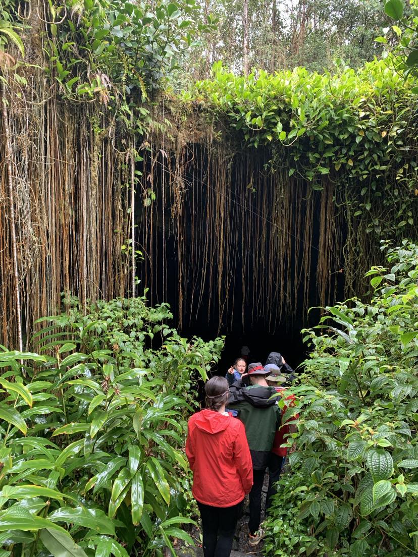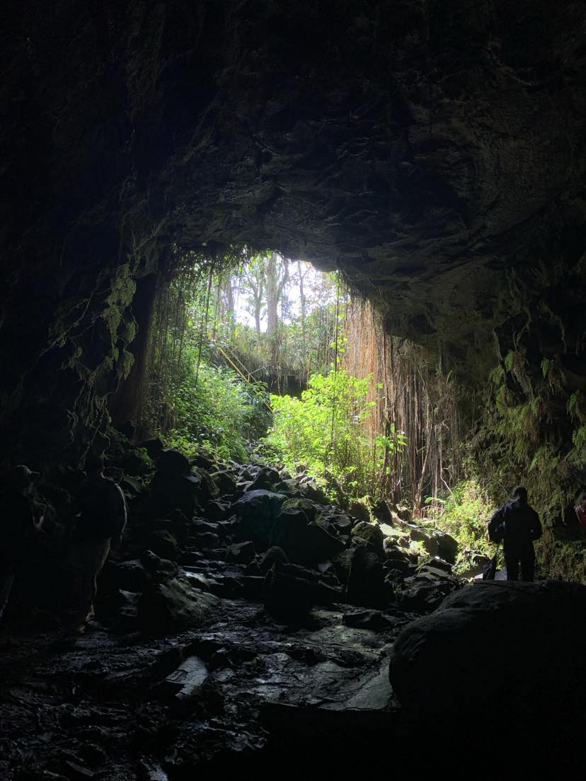 Aujourd’hui, petit déjeuner plus tard que d’habitude à 8h30 et départ du gîte à 10h. Victoire pour tout le monde et surtout Jérémie qui pourra enfin faire une grasse matinée bien méritée. Au menu ce matin : pancakes avec sirop au chocolat. On remercie Marie-Hélène ! Ensuite, tous dans le bus et nous nous rendons au Kaumana Caves. Un immense tunnel de lave qui s’est affaissé et qui a permis de créer une entrée naturelle pour visiter la grotte. Nous nous sommes séparés en deux groupes, car le tunnel était assez serré. Une fois à l’intérieur, Amandine nous as appris que les tunnels de lave se forment lors d’une éruption. Quand la lave coule la partie supérieure de solidifie rapidement au contact de l’air et crée une sorte de croûte par dessus la lave encore chaude qui, elle, continue de couler jusqu’à ce que la source s’épuise. Pendant que l’autre groupe avait lui aussi la chance de visiter le tunnel, nous sommes restés avec Tania où nous avons eu une discussion sur le nettoyage de plage que nous avons fait hier, l’environnement et nos habitudes de consommation.