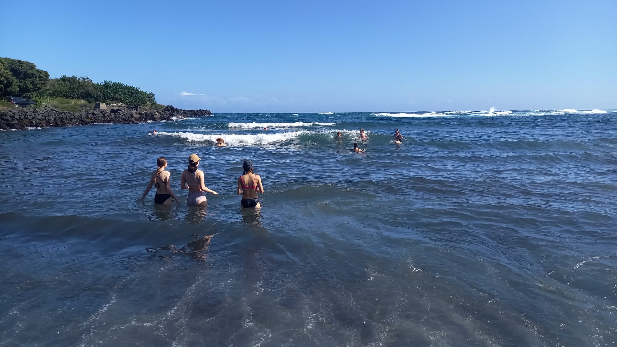 Nous nous sommes ensuite rendus à une plage de sable noir pour profiter de l’eau et des tortues ! Lors de cette baignade tout le monde s’amusait dans les énormes vagues où Mahée et Héloïse en ont profité pour bien tomber en se tenant au bras de chacune.