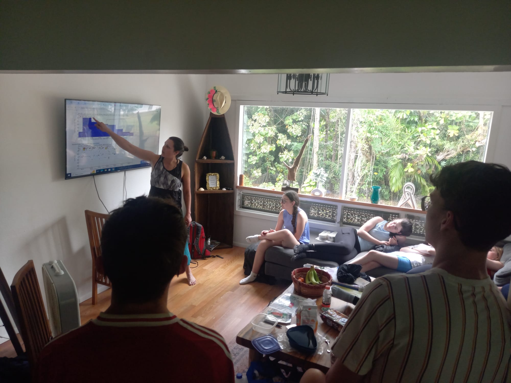 Le ventre bien rempli, nous avons récupéré le bolide pour nous rendre à la “Richardson Beach”. Nous avons d’abord débuté notre après-midi par un retour sur notre séjour. Un tour de parole à pris place sous l’ombre des palmiers pour partager nos impressions. Ensuite, c’était l’heure de profiter d’une dernière trempette et d’un coucou aux tortues. Nous avons profité au maximum de ce beau moment. Nous avons repris la route vers 16h30 pour retourner au gîte. Nous avons fait face à un embouteillage inattendu. Heureusement, Tania a trouvé un détour afin d’accélérer notre retour. À notre arrivée, quelques-uns ont débuté la préparation de leur valise et d’autres ont pris leur douche. Nous avons eu droit à un repas cuisiné par Marie-Hélène et nos deux accompagnatrices, soit du quinoa aux légumes, coco et curry.