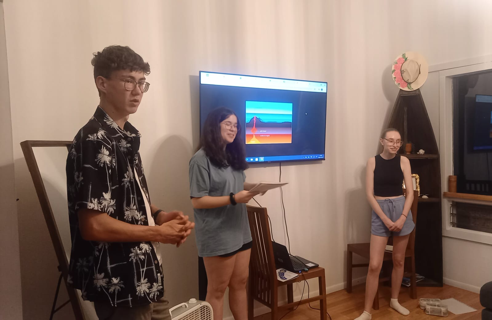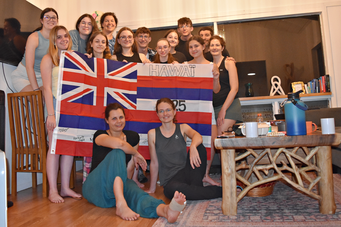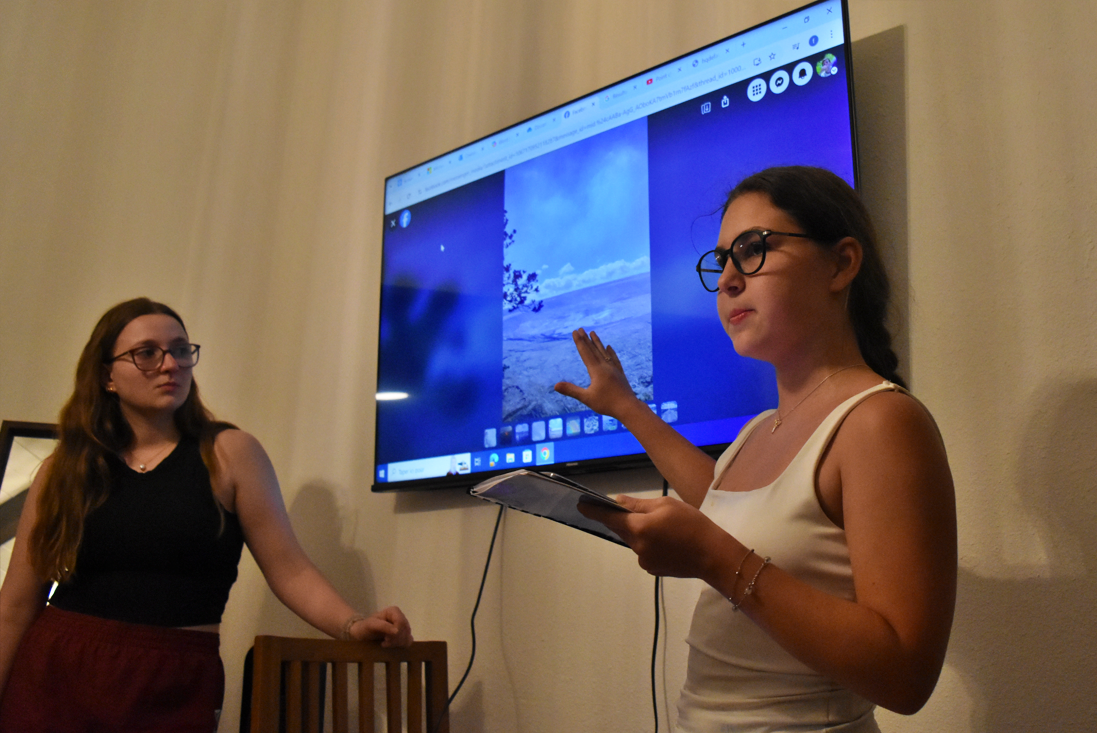 Nous avons terminé la soirée par la présentation de nos petits exposés scientifiques en équipe. Les points chauds, les morphologies volcaniques, les événement 2018-2020 et les risques naturels constituaient nos sujets. Pour conclure notre périple nous avons offert un souvenir à Amandine et Tania pour les remercier. Il s’agissait d’un drapeau d’Hawaï marqué par nos signatures. Malgré la fatigue qui se fait sentir, nous devions malgré tout préparer nos bagages pour le lendemain. C’est le cœur rempli d’émotions, de souvenirs et de nostalgie que nous allons passer notre dernière nuit sur cette magnifique île.