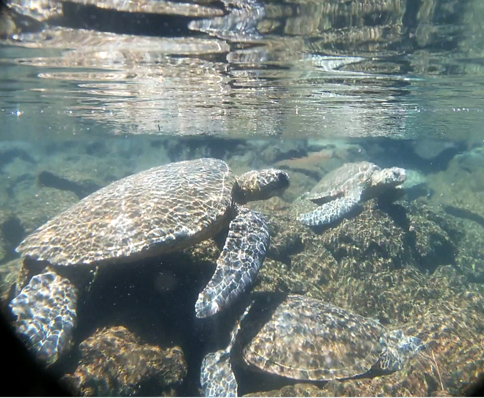 Pour poursuivre notre journée, nous avons embarqué dans le van, les bancs à la limite du point d’ébullition, pour nous rendre à la plage Richardson. Mya-Kim s’est procuré des palmes pour ne pas courir le risque d’une nouvelle rencontre avec les oursins (démoniaques). Alors que nous cherchions un endroit où des tortues de mer pouvaient se cacher, nos attentes ont été plus que comblées. Plus de 11 magnifiques Chelonioidae se faisaient bronzer dans un petit bassin en attendant que la marée remonte. Cette scène émouvante nous a laissés bouche bée, et même quelques larmes de joie ont été versées.