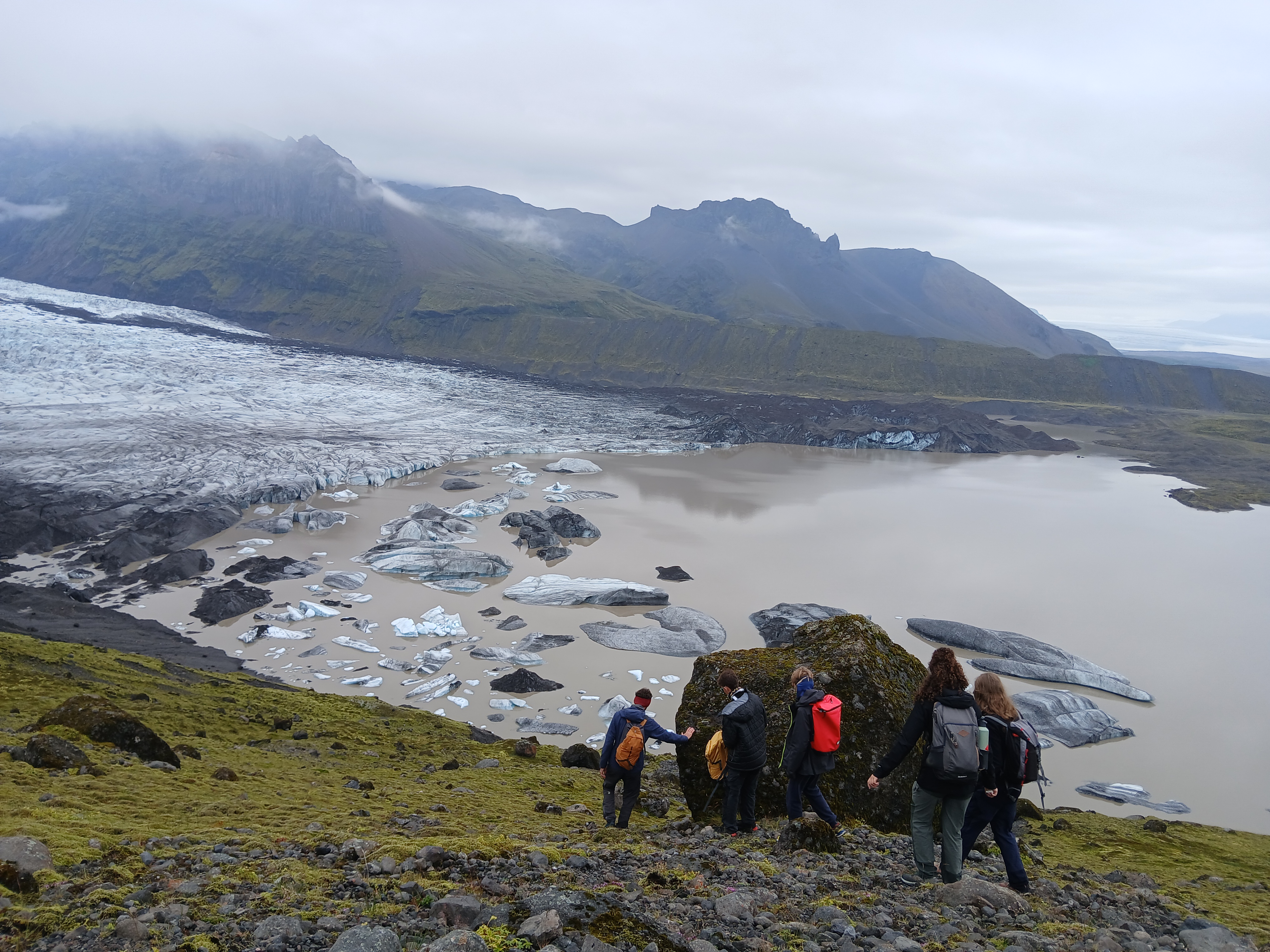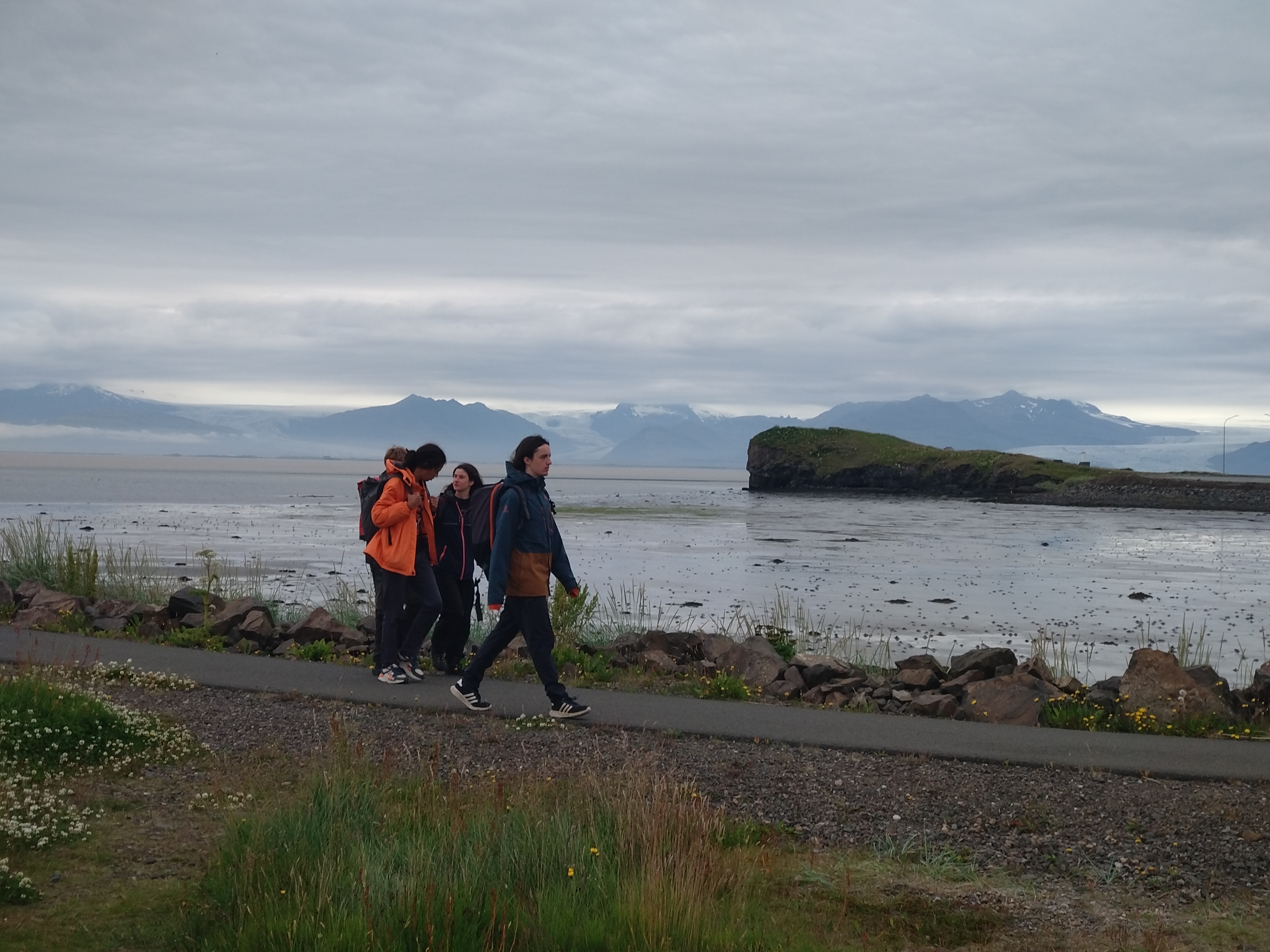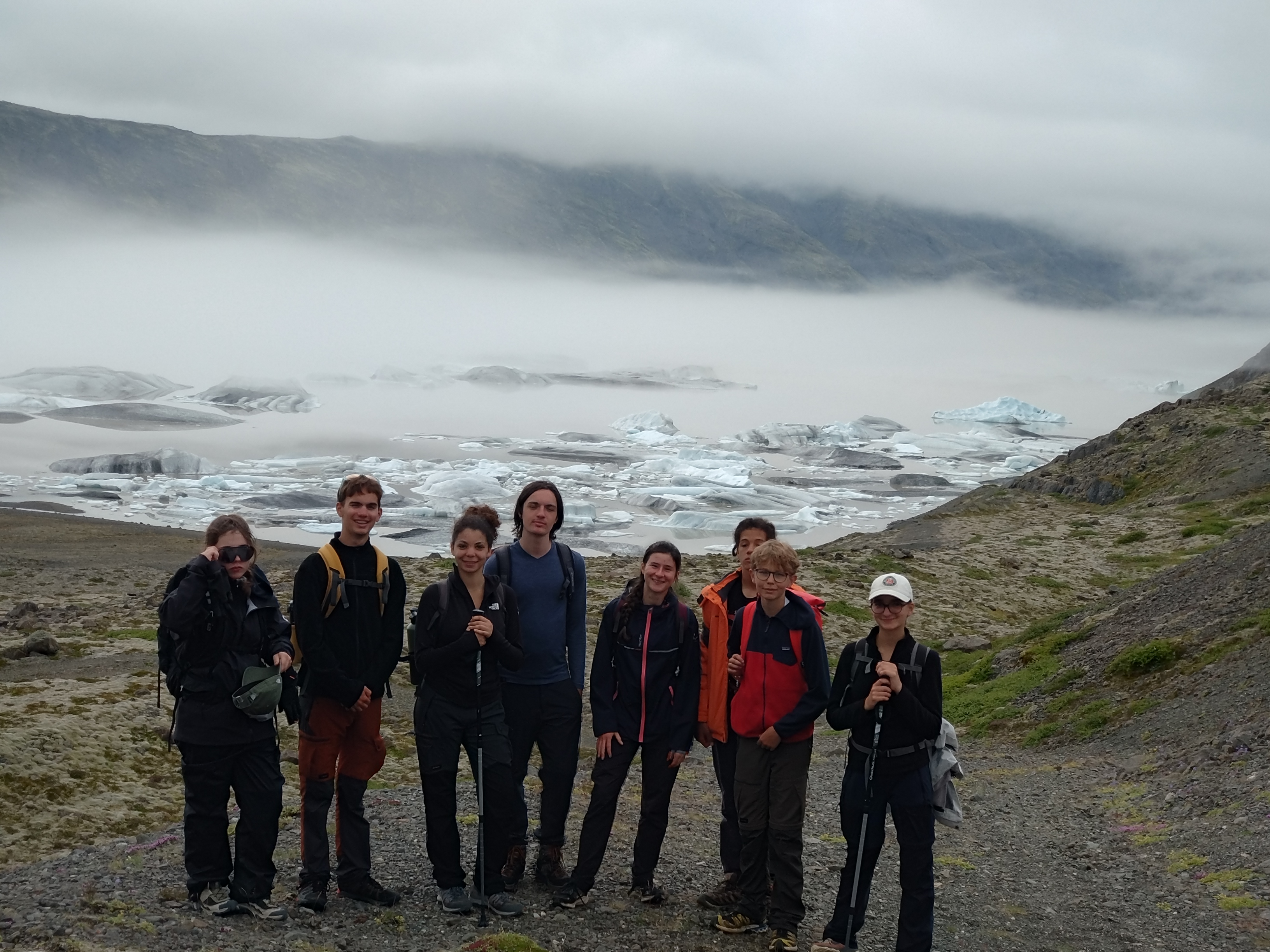 Après l’éprouvante journée d’hier, nous avons dormis jusqu’à l’horaire ô combien nécessaire de 9h. Malheuresement, la pluie était également au rendez-vous. Plusieurs tentes ont eu des fuites lors des plus fortes averses et Samuel a pu constater que son duvet était trempé au retour du petit déjeuner. Malgré tout, l’humeur générale était exellente (la participation de Pauline y a fortement contribué). Au vu des contraintes météo, nous avons reporté la balade pour récupérer les images de la deuxième caméra filmant un glacier à l’après midi, pour lui préferer une matinée à la piscine (quitte à être trempés, autant que ce soit agréable). Puis nous nous sommes rendus à la maison du parc national du Vatnajökull pour y déjeuner et visiter sa petite exposition sur l’Islande et son environnement. La météo s’étant éclaircie, nous avons pu ensuite réaliser la seconde partie de notre projet scientifique, en contemplant une marge proglaciaire (ancien emplacement du glacier avant qu’il se retire, ici très marquée par des moraines : des buttes de terre et de cailloux repoussés par le glacier lors de son avancée). La soirée étant déjà bien avancée, nous sommes rentrés au camp pour y déguster des spaghettis à la tomate. Et pour finir le journée en beauté mangue sechée au dessert et petite vaisselle de 30 min pour retirer la suie des casseroles. Nous finissons donc cette journée par un temps convivial avec un jeu et nous vous informerons du gagnant dans le prochain épisode...