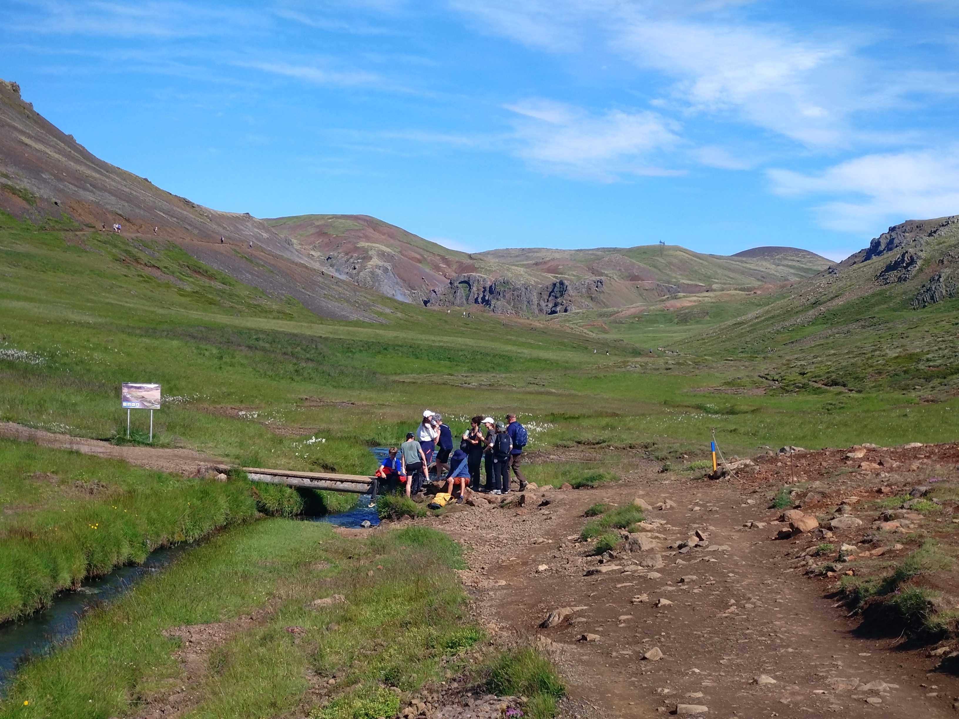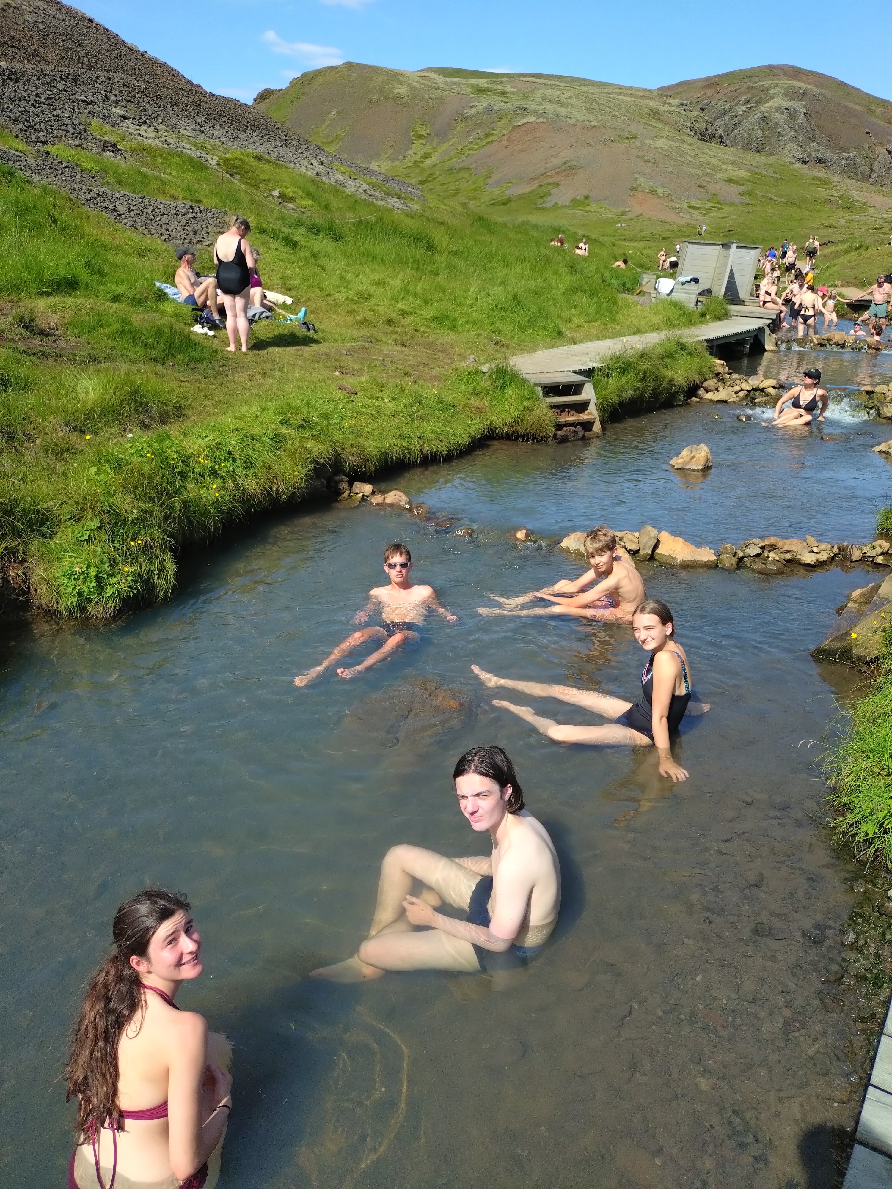 On a commencé la matinée par une ballade, sous un temps tropical pour l’Islande, c’est à dire 25°C et beaucoup de soleil. L’objectif étant d’aller se baigner dans une rivière chaude. Les sources très (trop) chaudes nous ont autant revigoré qu’engourdie. Puis direction le Lava Center, où les explications théoriques mais ludiques étaient sublimées par nos experts Hugo, Laura (et la passionnée Isabelle).
