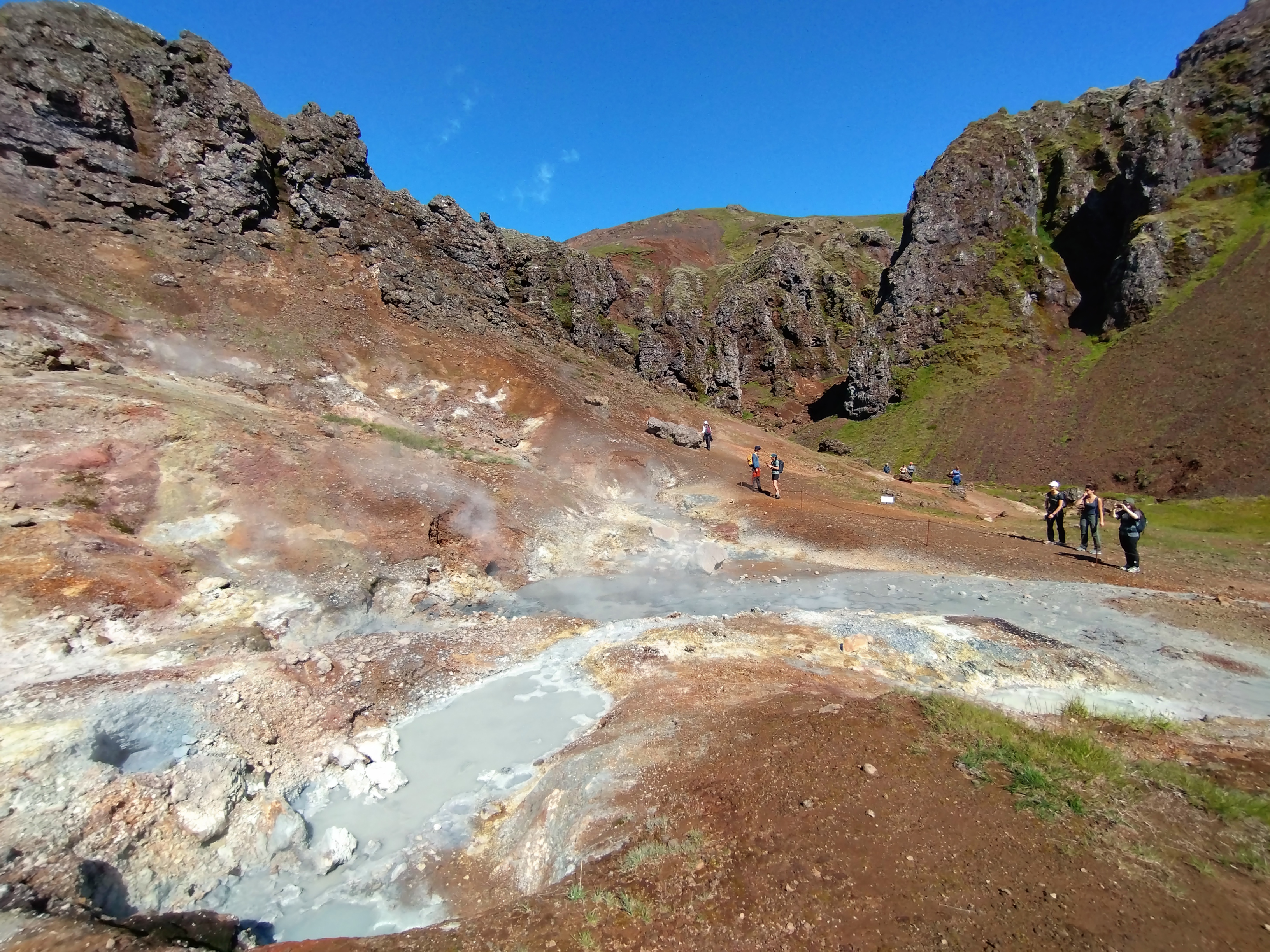 11h30 : départ (en tenue de randonnée). Environ 1 heure plus tard, nous arrivons à Gunnushver pour observer les fumerolles (jets d’eau et vapeur à haute temperature sortants du sol)