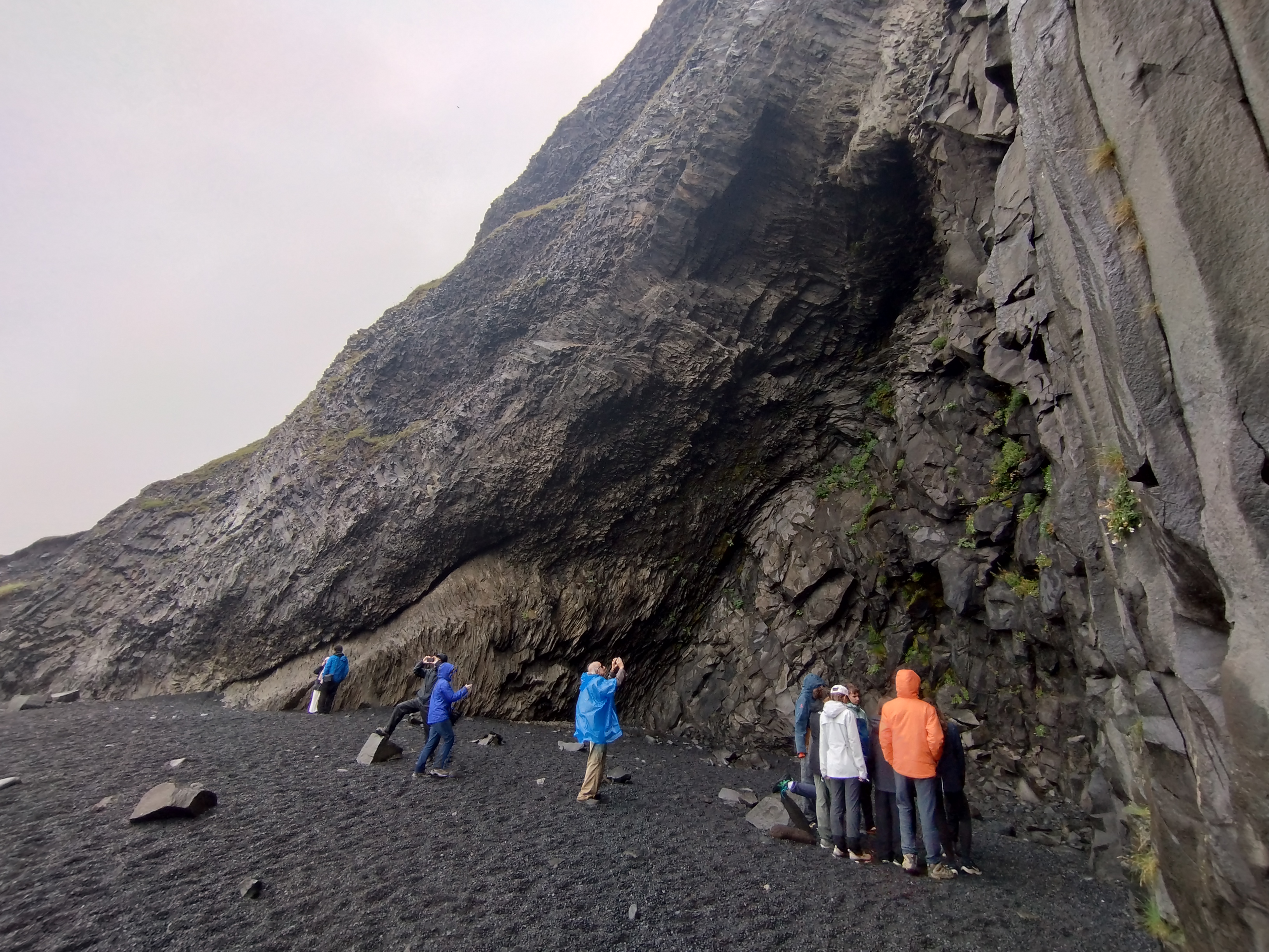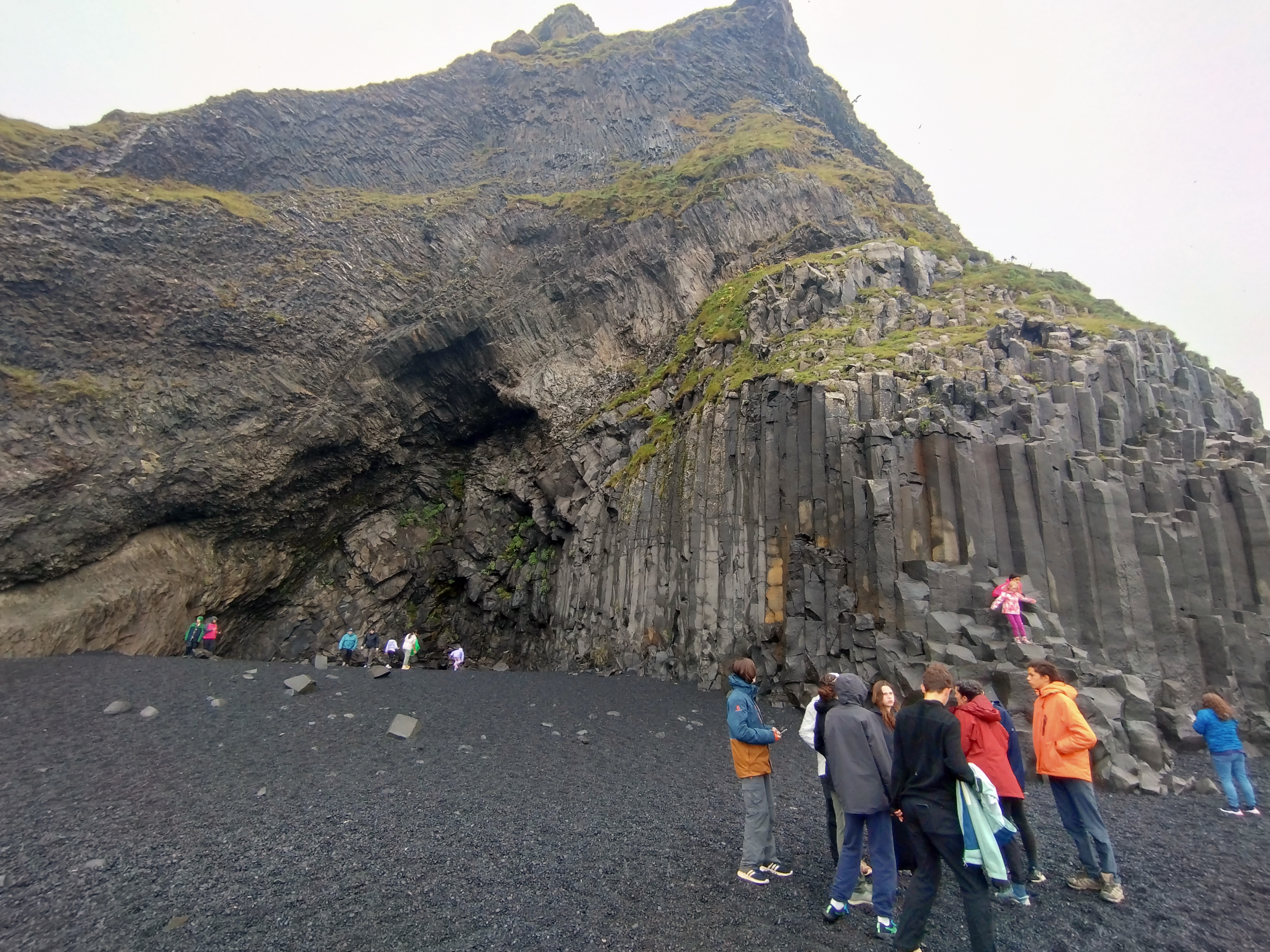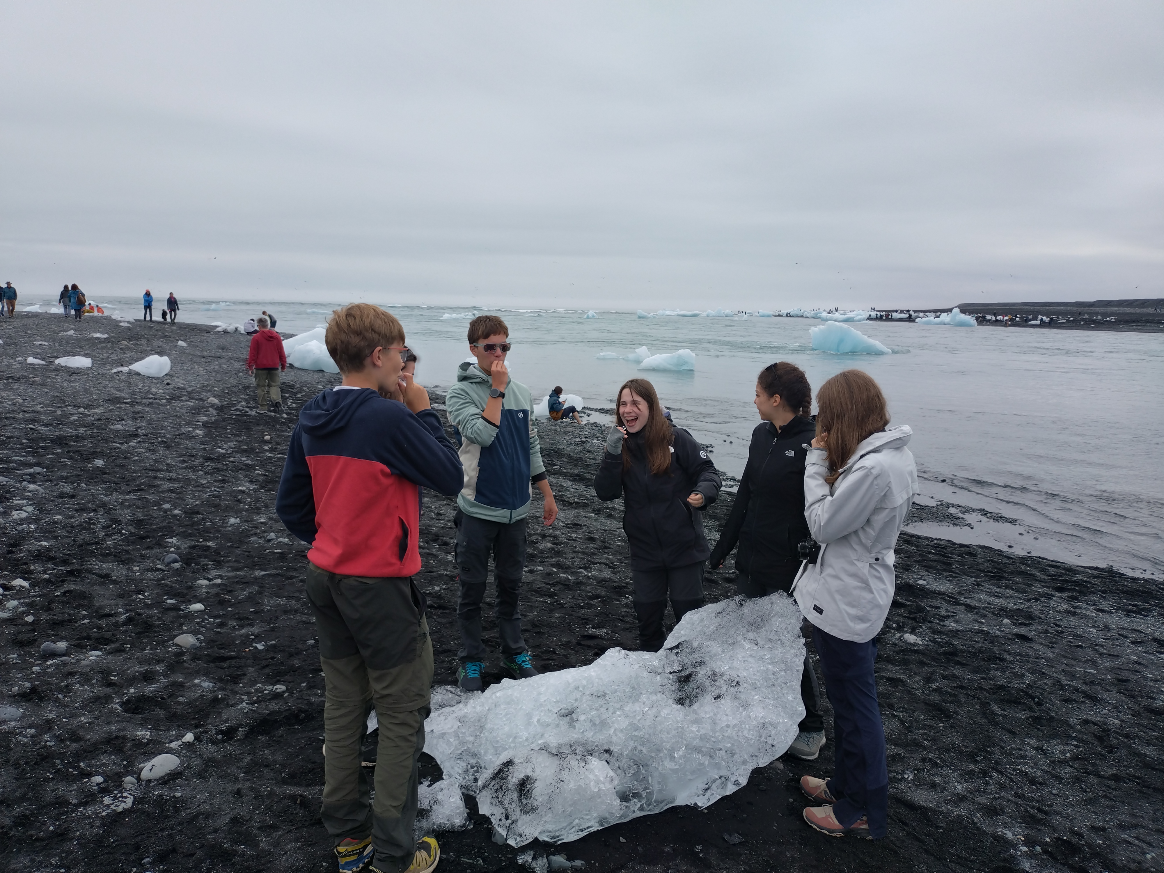 C’est dans l’air froid et matinal que l’on se réveilla, alors que les montagnes étaient couvertes par la brûme. L’ambiance générale est alors au rangement, car nous devons prendre la route dès le petit déjeuner. Après avoir finalement replié nos tentes et empaqueté nos affaires, nous montâmes à bord des deux véhicules : le van et la voiture. Au bout d’une heure de route, nous nous arretâmes à une coulée de lave d’une envergure de plus de 18 mètres cube, provenant d’une faille créée par la dorsale se formant actuellement en Islande. Nous avons ainsi appris que cette éruption, dont la fumée provoqua unr famine en Europe, était à l’origine de la Rėvolution française. Datant de 1780, la coulée à eu le temps de se couvrir d’une mousse protégée(car mettant plusieurs siècles à pousser de quelques centimètres à cause des rudes conditions climatiques de l’île) créant alors de magnifques reliefs soulignant le mouvement spécial et caractéristique de la lave. Nous nous arretâmes une seconde fois pour nous sustenter avec une délicieuse salade de riz préparée la veille par l’équipe de cuisine. Nous fîmes ensuite un stop dans le café d’un ami d’Hugo et Laura, où nous pûmes déguster de délicieux chocolats chauds et admirer la danse de sternes arctiques territoriales, affairées protéger leurs nids. Le dernier arrêt nous permis de contempler le plus grand et profond lagon d’Islande, dans lequel flottaient d’immenses icebergs, emportés par un violent courant les livrant à la mer. Nous avons aussi eu l’occasion de goûter une eau pure et glacée, âgée de plusieurs siècles et d’enfin voir les fameuses plages de sable noir, symboliques d’Islande. Nous arrivâmes enfin à notre campement avoisinant la ville de Hofn où nous réinstallâmes nos tentes. Après un petit temps calme, nous mageâmes de délicieuses pâtes aux poireaux et au saumon, en s’assurant de prendre des forces pour le lendemain.