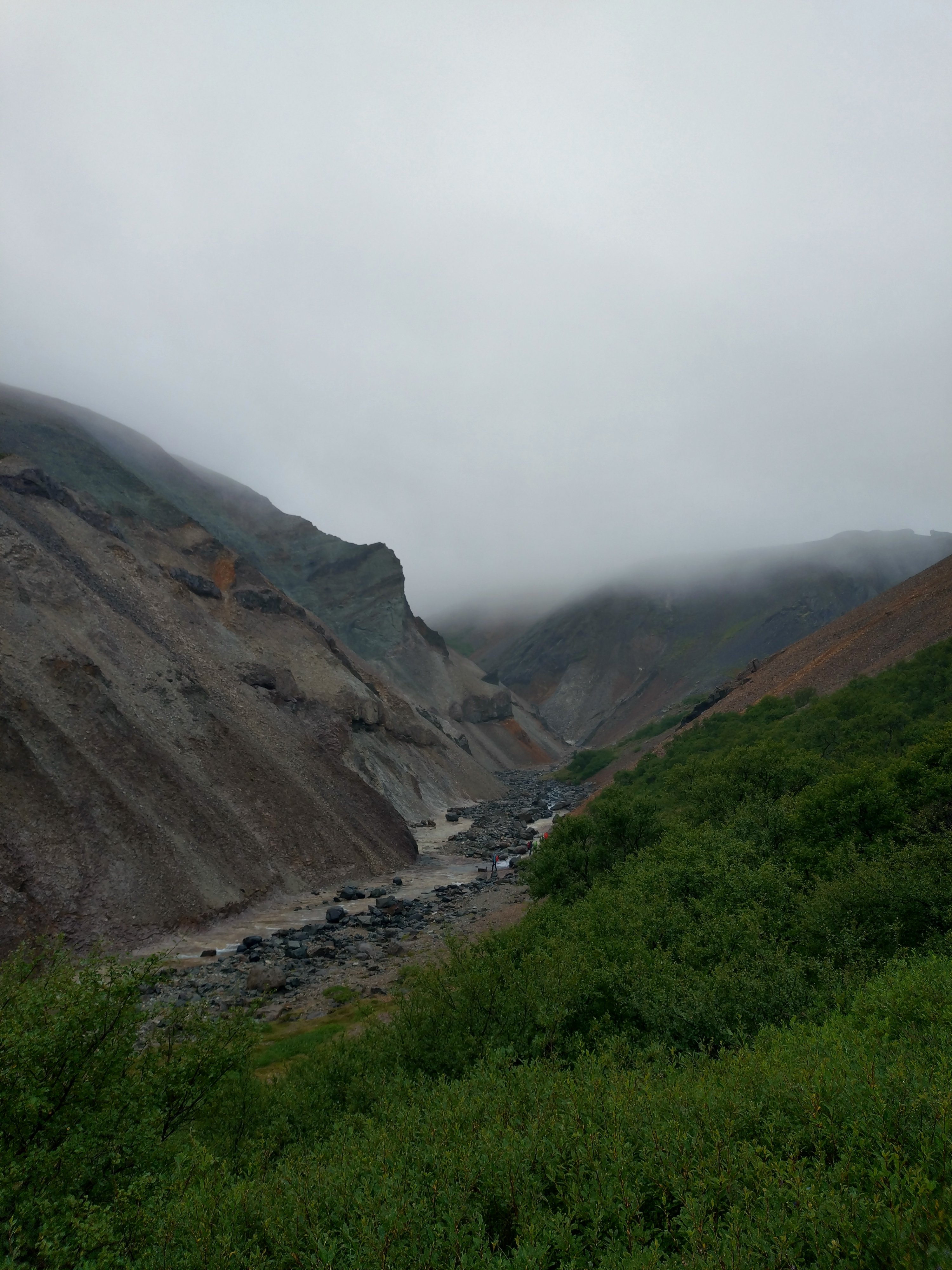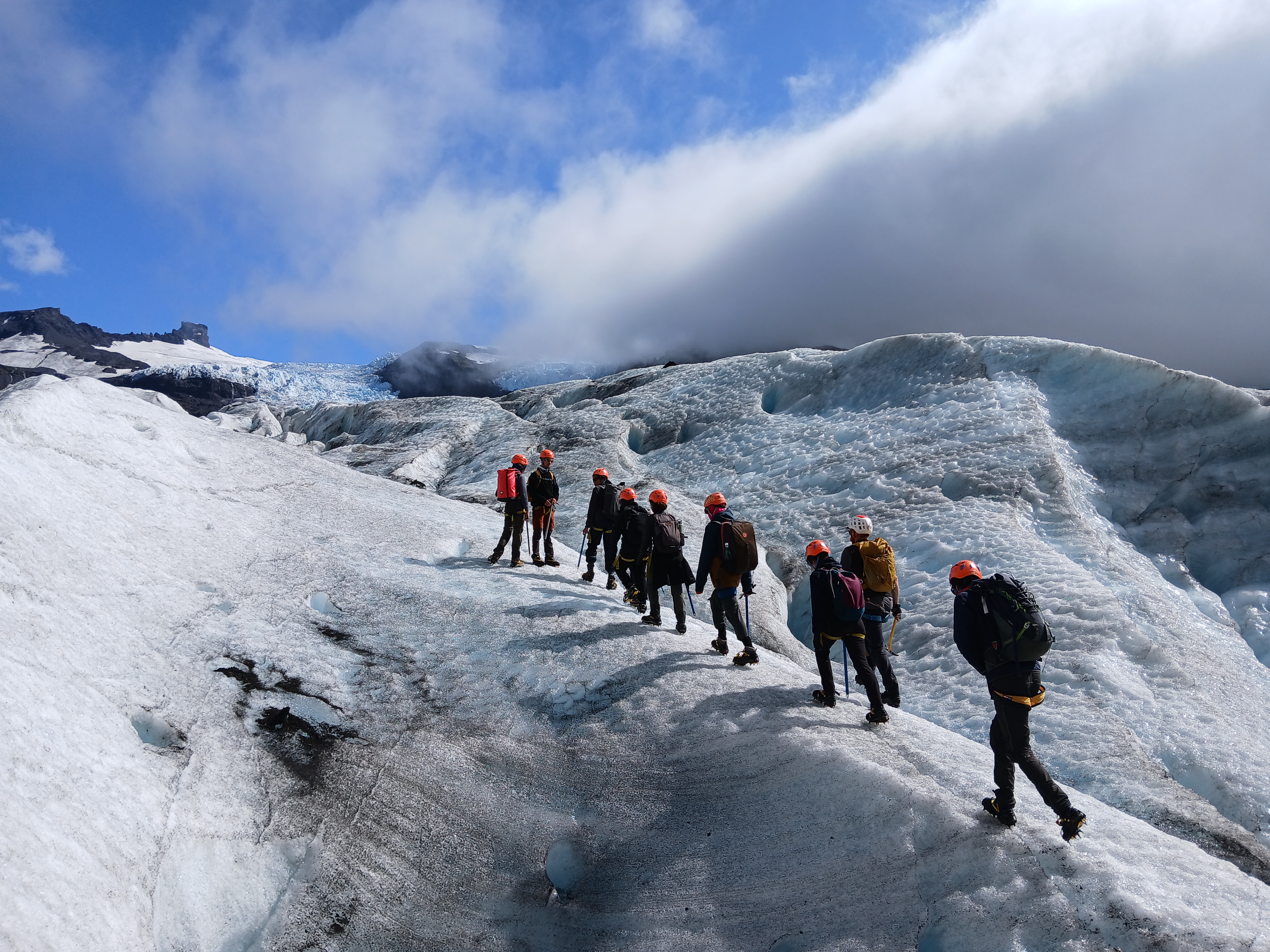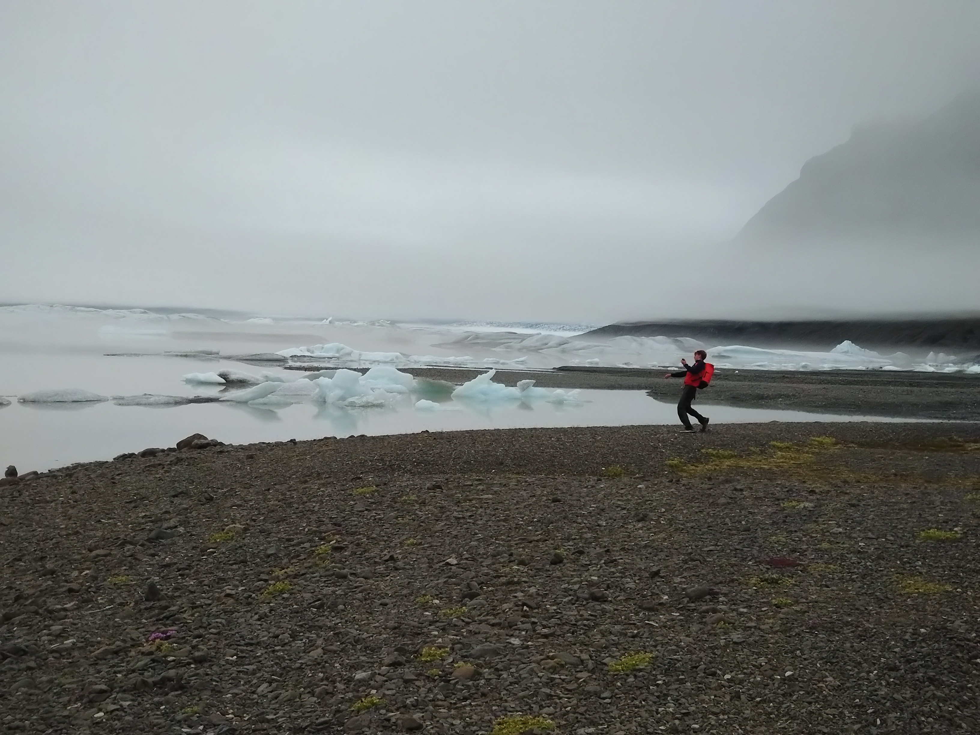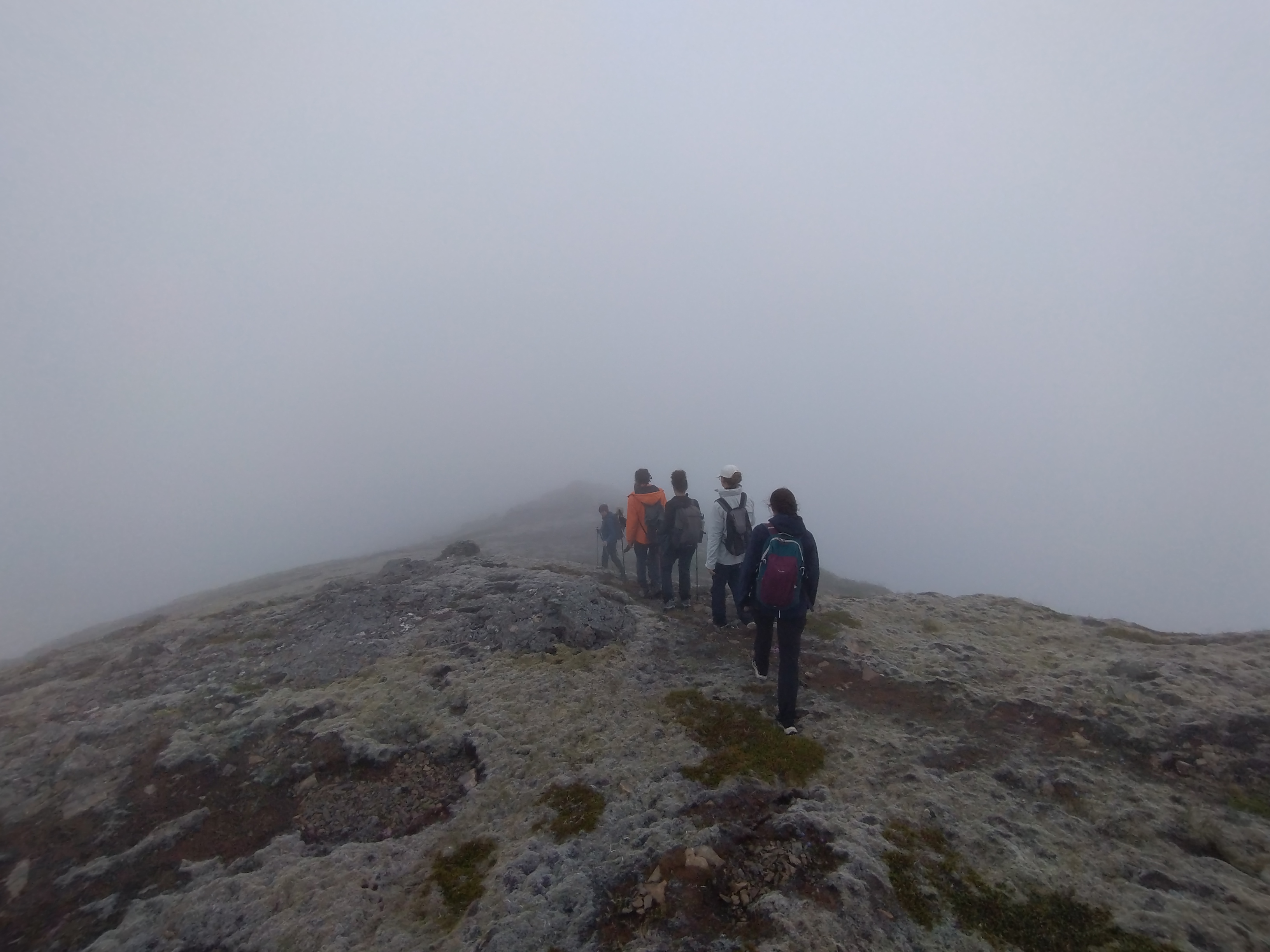 Nous arrivâmes donc sur le début de la randonnée à 9h00 et marchâmes la quasi-totalité de cette randonnée sur une crête et nous fîmes 2h sur les 3 de marche dans la brume. Arrivés en haut, nous cherchâmes puis trouvâmes une caméra ayant pris chaque jour le glacier en photo pendant 4 ans et enfin nous mangeâmes avec avidité nos sandwich confectionnés avec soin le matin même.
