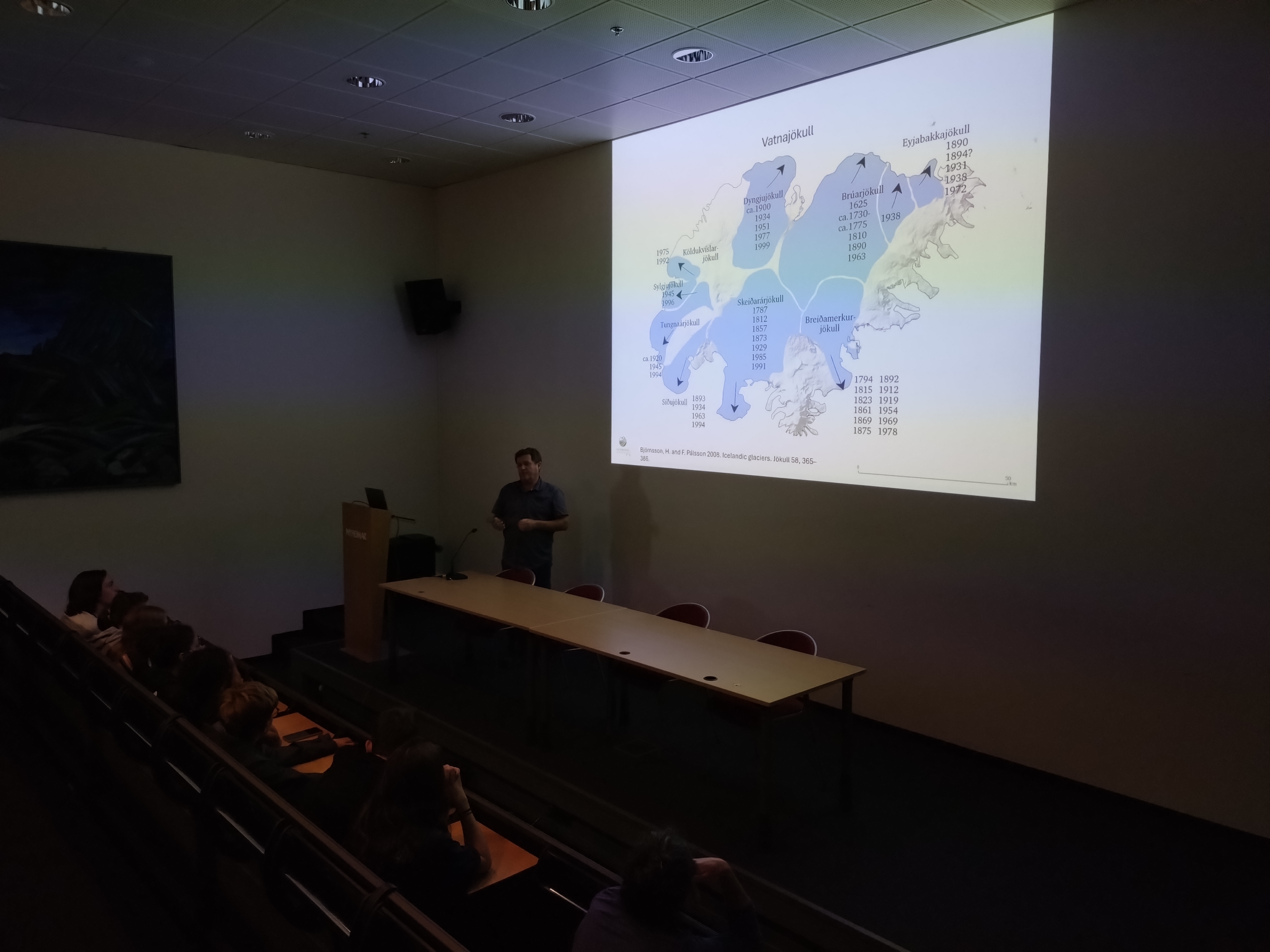 Grasse matinée ce matin, Laura et Hugo nous ont laissé dormir jusqu’à 9h. Grands seigneurs ! Ils nous ont donné ce privilège du fait de la longue journée de la veille. Nous avons donc commencé notre journée tranquillement par un échange de 2 h 30 avec un géographe, Þorvarður Árnason et un glaciologue, Snævarr Guðmundsson deux chercheurs professeurs à l’University of Iceland, et le centre de recherche de Höfn (prononcer Hoeupn).
