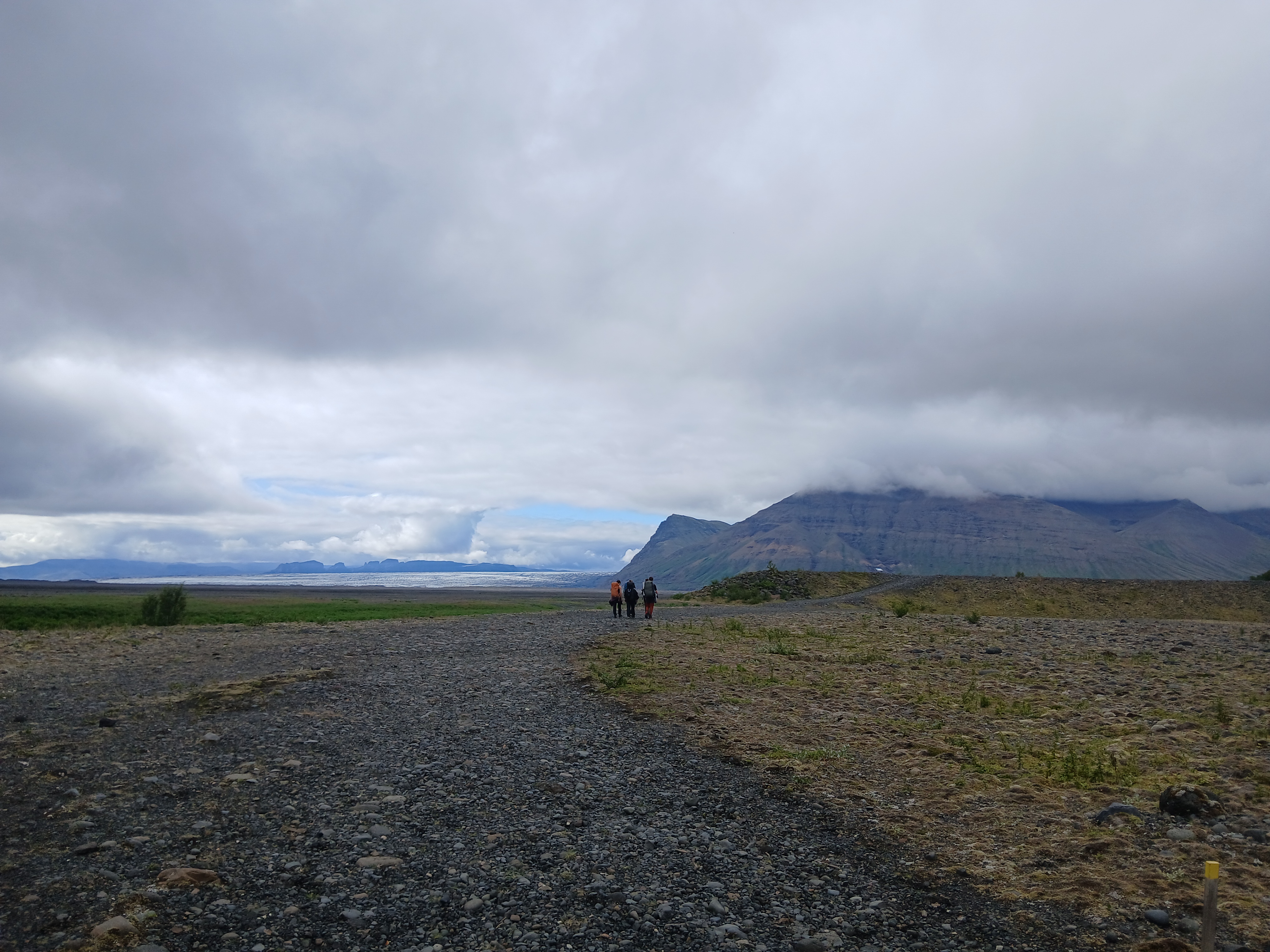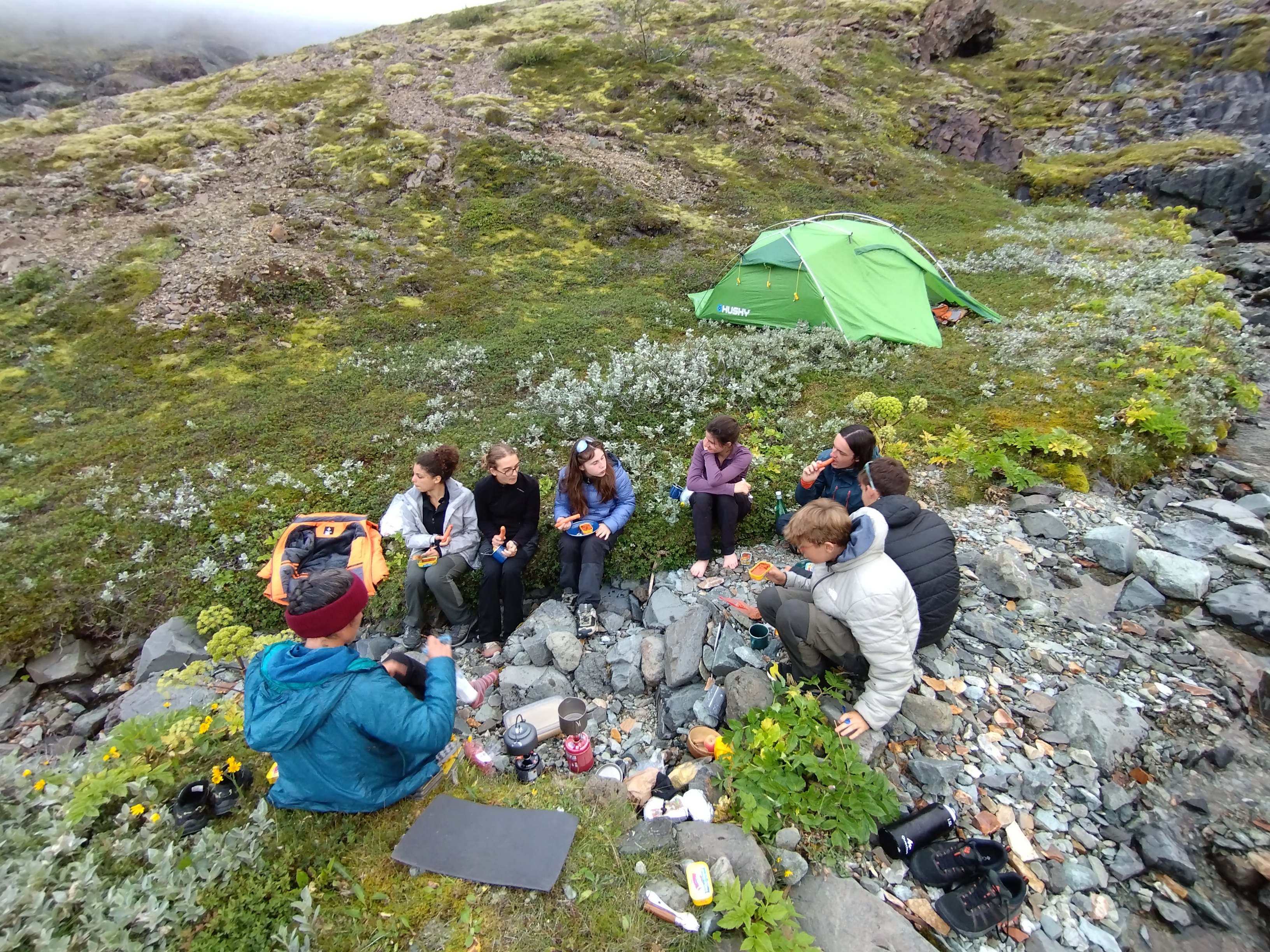 Ce dimanche 20 juillet, nous nous sommes reveillés pour une journée bien remplie. Nous avons commencé par organiser nos sac de façon à ce qu’il ne reste que les affaires nécessaires pour une nuit de bivouac. Une fois nos vêtements chaud rangés, Laura a pris le soin de répartir le reste des affaires communes dans chacun de nos sac, tentes, nourriture... Puis, nous avons preparé nos sandwichs pour le midi du lendemain, après avoir mangé une delicieuse salade de lentilles sur la route. Nous avons ensuite installé nos sacs sur notre dos et sommes partis pour 9km de pur bonheur. Apres 6km sur une étendue infinie de cailloux, le sandur de Skeidarárjökull, nous nous sommes retrouvés à la lisière d’une fôret, synonyme du début de notre ascension. C’est sous un soleil brûlant que nous avons pu, au cours de cette randonnée, voir des animaux tel que des jeunes renardaux ou des lagopèdes. C’était une première pour nous que de traverser des paysages composés de tant d’arbres, nous qui étions habitués aux grandes étendues de bazalte couvert de mousse. C’est à la fin de 450m de dénivelé positif que nous nous sommes arrêtés pour installer le campement sur les bords d’une rivière. Cela nous a permis de découvrir le camping sauvage, nous abreuvant dans l’eau douce et pure de la source en amont. De plus, nous avons eu la chance de voir des orgues basaltiques (formations volcaniques). Nous nous sommes rassasiés grâce à de la semoule et des maqueraux à la sauce tomate, diner simple, delicieux et pratique à transporter. Enfin, nous nous sommes couchés à quatre dans une tente pour un repos bien mérité avant la longue journée du landemain.
