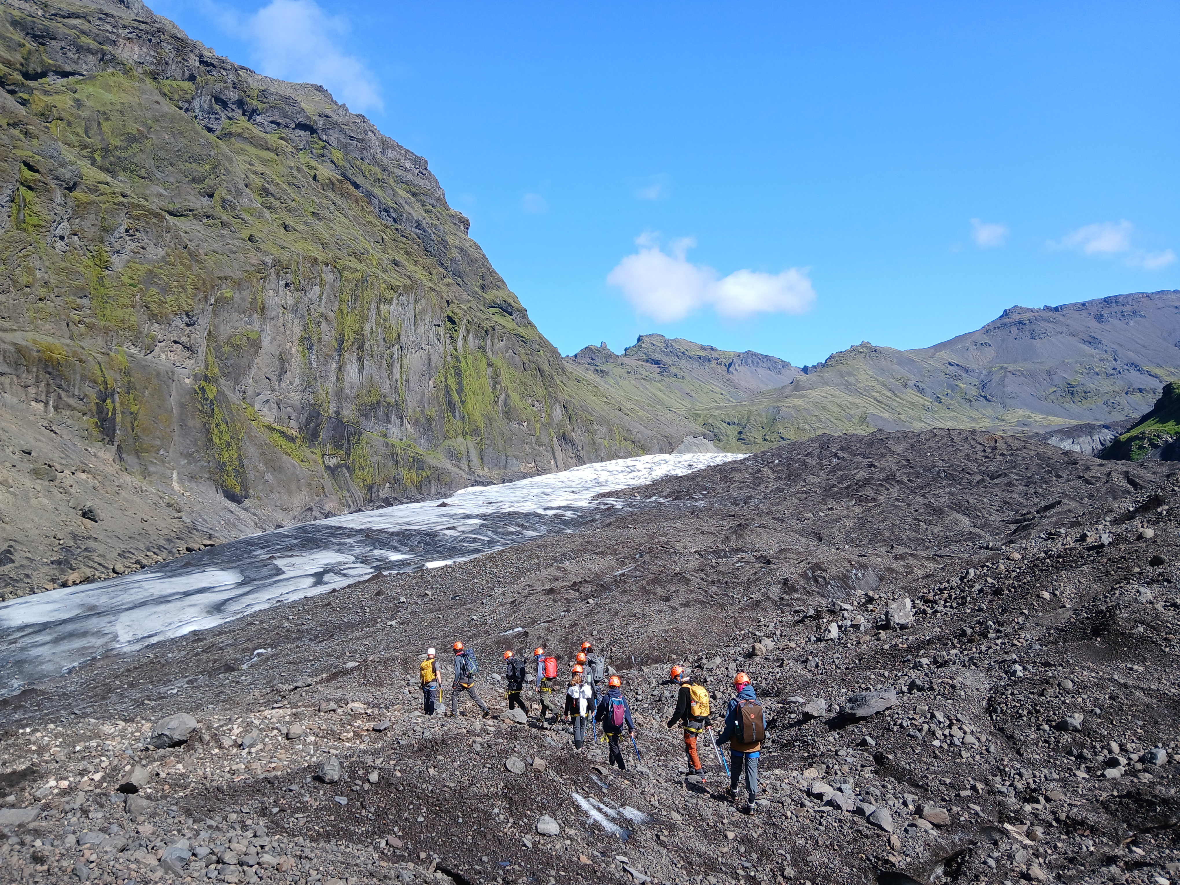 Nous avons entamé une marche sur un mont culminant à 200 mètres d’altitude pour mieux observer le glacier. Pour cette expédition, nous avons délaissé les sentiers battus et avons pénétré dans le géoparc du Katla où nous avons participé à une partie continue de « moss is lava », consistant à eviter l’une des nombreuses mousses locales protégées, en empruntant des chemins originaux.