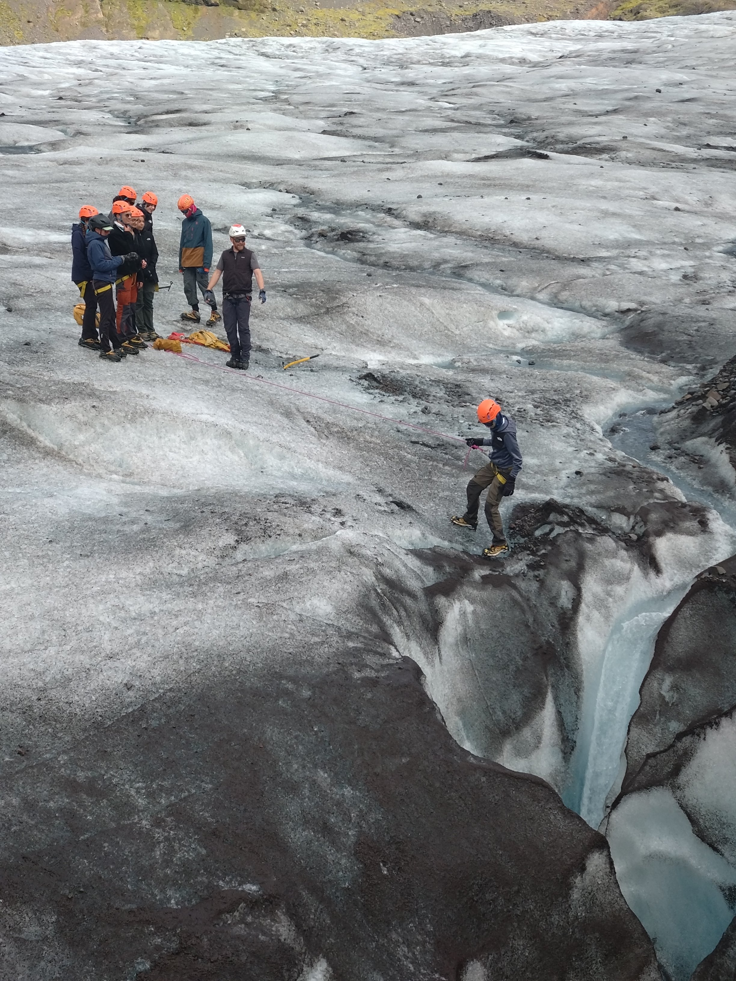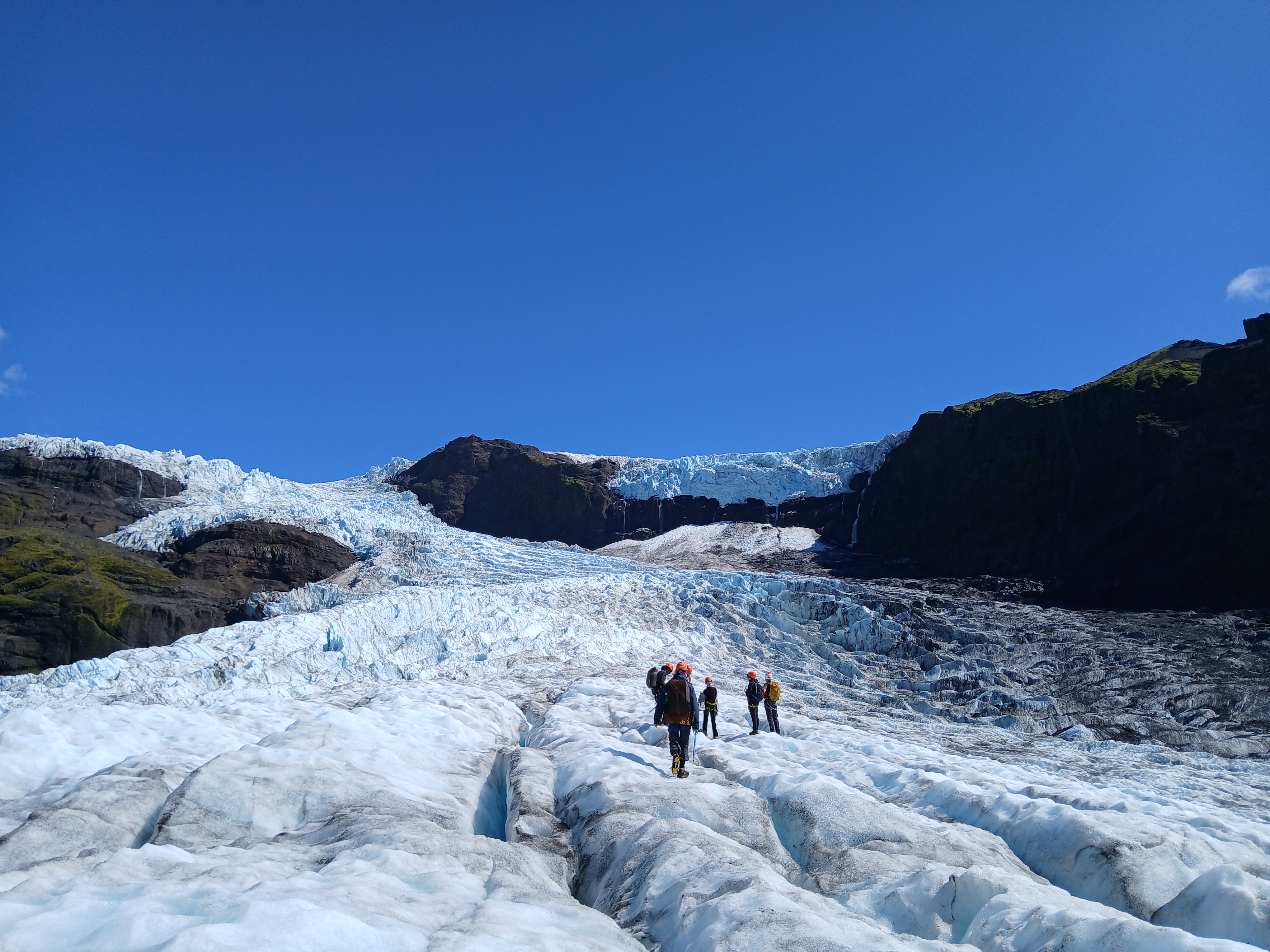 Nous avons aujourd’hui profité d’un rare répit sous forme de grasse matinée : le petit déjeuner est à 8h. Ensuite, départ vers l’un des glaciers à l’est de notre camping de Svinafell. On fait d’abord escale chez un guide de haute montagne écossais. Armés de crampons, piolets et de piques contre nos ennemis les Anglais, nous entamons notre traversée du glacier de Virkijökull, le glacier à la forteresse. Une file de mineurs mineurs assujettis se dessine sur un paysage de probité éternelle surplombée par une barbacane rocheuse. Nous baignons dans un passé géologique aussi opaque que la météo islandaise, aujourd’hui pourtant clémente. Des colonnes basaltiques confuses se dessinent de façon intermittente, poussant même l’illustre Laura à l’indécision. Sur le glacier étincelant par une rare explosion de rayonnement, nous observons plusieurs générations de trolls, des moraines miniatures qui se déplacent la nuit et se transforment en pierre sous le soleil. Nous avons également l’occasion de contempler de près et de loin des fractures dues aux écarts de vitesse des différentes portions du glacier. Dans ces havres protégés du rayonnement solaire, la glace est plus compacte et dévoile son teint bleu pâle. Arrivés à une chaîne de fissures impracticables, nous nous engageons sur le chemin du retour. Nous nous appliquâmes alors à la tâche de ternir nos crampons en les trainant sur une moraines meubles perfides, avant de retrouver le van et la Dacia dévouée.