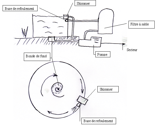 [3] skimmer : pièce d’évacuation reliée au circuit d’aspiration permettant d’évacuer les saletés flottantes