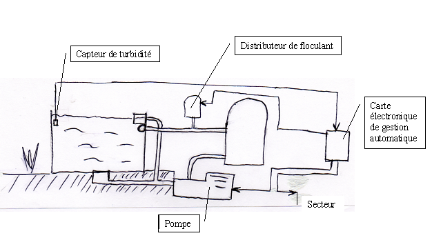 Principe : à un certain degré de turbidité, la filtration se met en route, injecte du floculant, tourne un certain temps pour mélanger, s’arrête pour laisser reposer et déposer, se remet en route pour éliminer toutes impuretés.