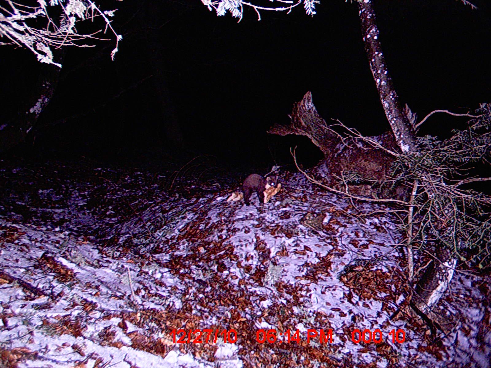 Ce matin petit tour en forêt pour relever les pièges photos. Le premier n’a rien donné par contre le 2àme a révélé que notre visiteuse était revenue pendre notre pain.