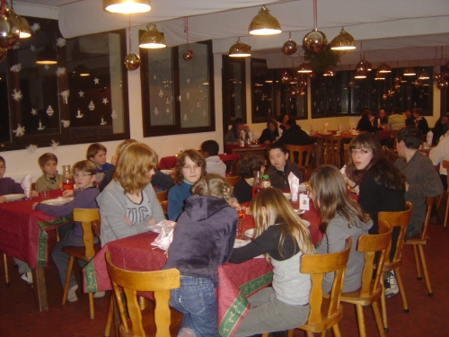 Soirée réveillon avec repas de fête, les enfants se voient attribués des tables un peu éloignées de leurs animateurs pour être ensemble et profiter pleinement de ce repas réveillon.